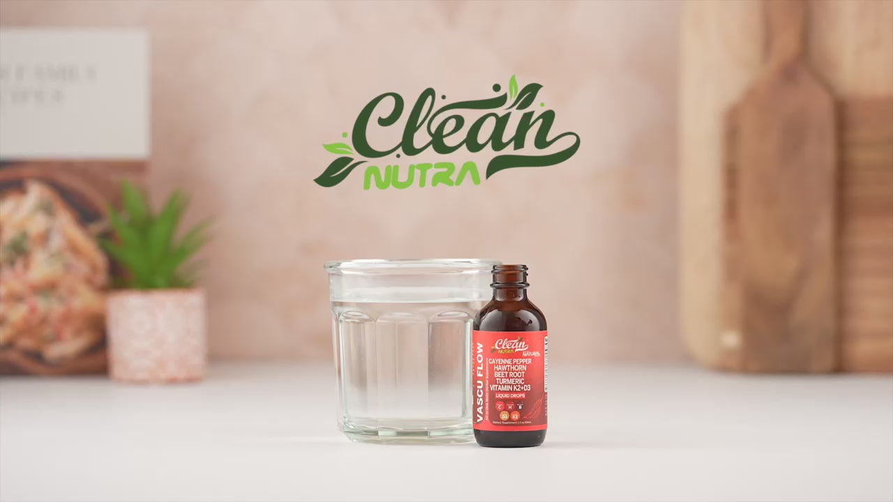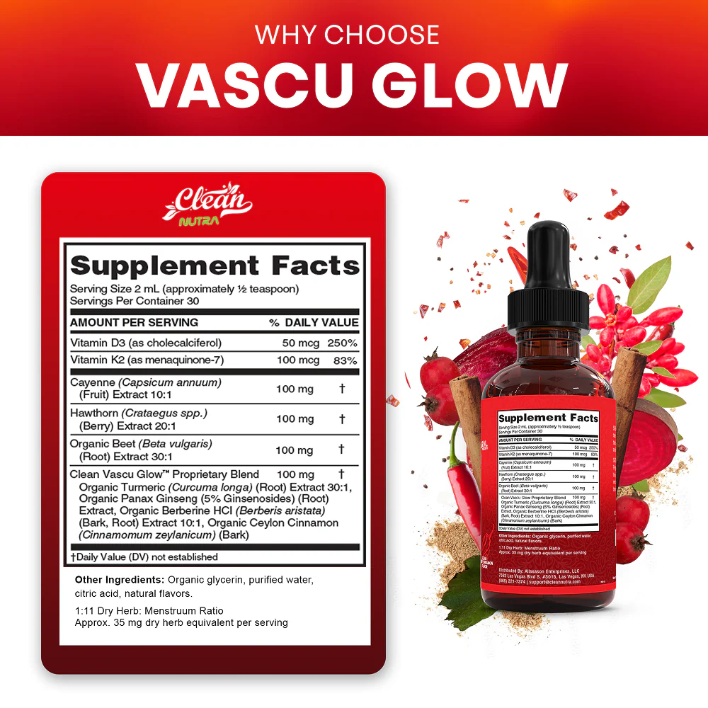 Vascu Glow™ is a liquid supplement combining cayenne pepper, beet root, turmeric, ginseng, and other botanicals with vitamins D3 & K2 to support circulation, vascular health, digestion, and overall wellness.